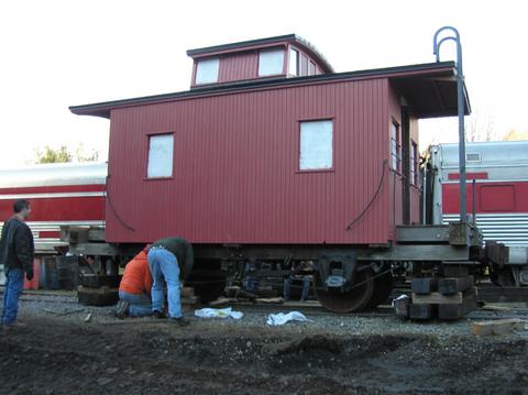 "Please join me in congratulating John LaBarre and his team for their completion of the bobber railing project on Wednesday, 11/28/07 at Arkville – John and his `on site team of the day' (Joe Marsh, Doug Cronk and I ), with some help from the D&U track crew lowered 8206 onto her axles and hand rolled her a few feet – the whole operation went smoothly, prompting me to realize what an incredible job John had done with the underfame, and Steve Lebowitz had done with the overall carpentry. All the sags we saw in the underframe when on her cribbing straightened out once she sat properly on her wheels and the following day, the D&U track crew hand rolled her approximately 150' without much effort through a reverse curve and coupled her to D&U Alco S-4 diesel 5106, where her knuckle locked into 5106's with less than a 2" vertical difference (the caboose is higher, in part because she has yet to be fully outfitted with at least 1000 pounds of gear, including steps, stove, and other hardware)" It is hoped that the 8206 will run at least as far as Halcottsville sometime in spring 2008. Burr HubbellYou can visit the U&DRHS at: http://udrrhs.org/