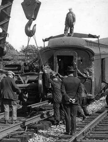 The bodies of the men were wedged under the debris in the forward seats of the day coach. Playing cards were strewn about and on the roadbed outside their window. Several of the other passengers were trapped in their seats by the telescoping of the car. The first physicians who entered the coach told of one young woman whose hand was crushed beneath a broken seat and who watched without a whimper while debris was cut away.