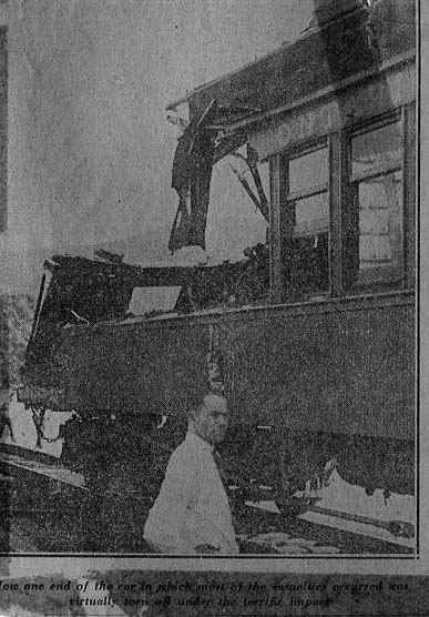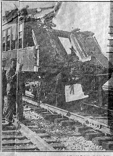 How one end of the car in which most of the casualties occurred was virtually torn off under the terrific impact.