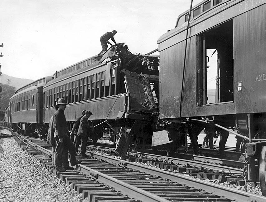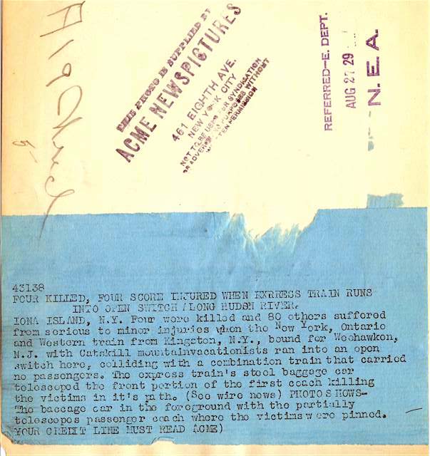 The engine and first three cars of the passenger clattered over the switch and plowed into the freight. A.J. Lewis the baggageman on the passenger, who was seated in the door of the car watching automobiles speed over the arch of the Bear Mountain Bridge, was thrown the length of the car but sustained only a slight hurt to the hand.