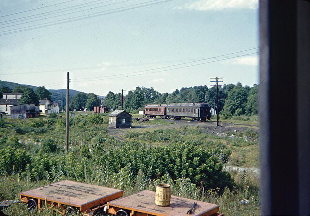 Yes, I know....Summitville once again, but can you blame me? This unbelievable color shot came my way a few months ago and I have been waiting to share it ever since. The date is July 31, 1953. The passenger stop at Summitville provided a good opportunity to capture the Kingston Branch yard and wye area. Two grampuses are in the foreground (that's what they were called on the O&W and some other RRs). Just beyond them is the dirt road to the station. Adam's store and mill are in the background on the left, along with one of the lumber sheds and in the distance is a boxcar and flanger. With steam gone for five years, the rails over the ash pit have been removed. Two tired looking work coaches sit just beyond