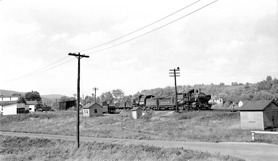 In August 1939, Bill Lichtenstern, Ed Hermanns and George Votava spent a wonderful Sunday the 13th at Summitville, photographing the activities (Am I envious? Boy Howdy!). During one lull in the action, Bill stood on the mainline and took this shot of the Kingston Branch end of things. Besides showing the two V-class engines laying over for the weekend at the rudimentary engine service facility, it is a great view of the little branch storage yard, lumber storage sheds, the two cabooses assigned to branch service, Adam's store and mill, and the North leg of the wye. Jack Farrell Collection - Caption by Jeff Otto