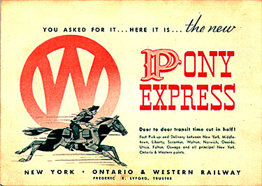 The Florist Telegraph Delivery (FTD to most folks) took a risk when they chose the image of Mercury, the Roman messenger of the Gods, to be the symbol of their rapid service. Is Mercury or Hermes (the Greek version) as expressive a symbol as the Pony Express Rider? Certainly not for a red-blooded American! Mercury lacks American national identity. Ancient mythology did not have six-guns, the Great Plains, broad-brimmed hats and Indians of our own nineteenth century, and the O&W certainly knew it! None of that effete European stuff for lower New York State! When the railroad introduced a new freight service in 1939, it had a masculine resonance and the promotional material made sure that impression got out to the public.