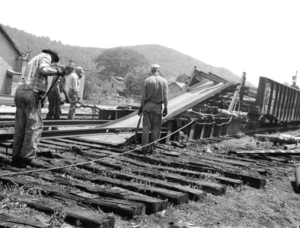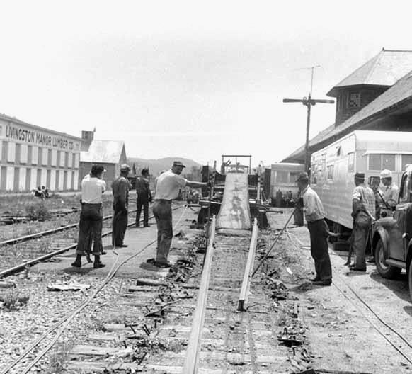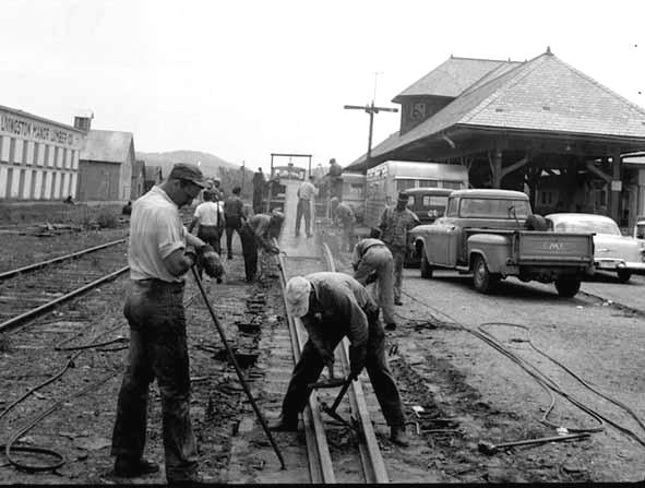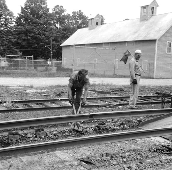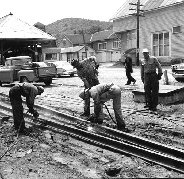 The Salzburg scrapping train in front of the station. After pulling up the spikes, the crews would cut the bolts holding the rails together and then pull the sections of rail onto the gondola using a ramp and winch system. Its easy to forget just how heavy this stuff really was....