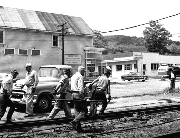 These photos were taken in 1958 by a Manor resident. They were sent to me by Wayne Levitt who knows of my interest in the railroad in Livingston Manor. Over the years, Wayne has provided an amazing amount of information that I’ve used in building my layout. These photos show not only the sad end to the railroad, but also an area of Livingston Manor that has all disappeared. Today much of this area has been redeveloped and few recognizable landmarks remain.