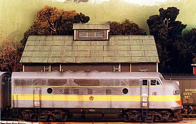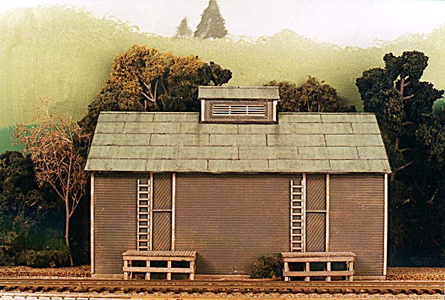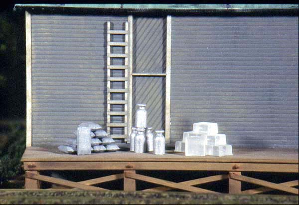 From the Editor's Desk: Here are some spy photos taken by one of the Port Richmonds neighboring roads as F-3 #822 rolls past a scratchbuilt O&W icehouse and another photo showing just the icehouse itself, which was built entirely out of styrene. The ladders are Evergreen ladder stock kits and the roof is masking tape. Perhaps one of the PR's competitors is eyeing some of the milk business? Stay Tuned.......