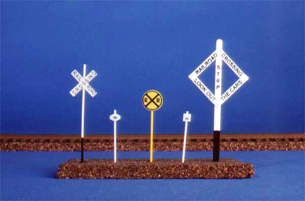 If you prefer the standard RR Crossbuck, kit #1009 will give you twenty of this style and if you are a Canadian modeler, kit #1021 will give you ten of the Canadian style crossbucks; both are $4.95 each. While you're working this signature O&W sign into the grade crossing scene plant a yellow crossing warning sign, the round one with the R X R, on the road approaching the grade crossing. #1008 will give you 20 of these for $4.95 and #1023 will give you 10 of the earlier styles.