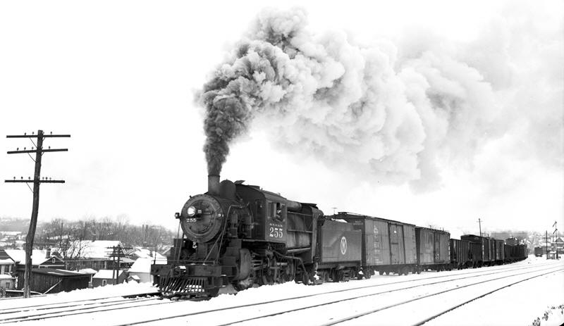 On January 25, 1941 A.V. Neusser captured NYO&W U class 2-6-0 No 255 leading a 14 car eastbound freight on the Middletown and Unionville Railroad to connect with the New York Susquehanna & Western at to Hanford Jct. The O&W and the M&U had a long relationship that included the M&U leasing the East Main St. depot along with the track and land from there to milepost 1.1. The NYO&M had built this 1.1 mile of track over the Erie main line to connect the Middletown Unionville and Water Gap, predecessor to the M&U, to the main tracks at Railroad Ave.