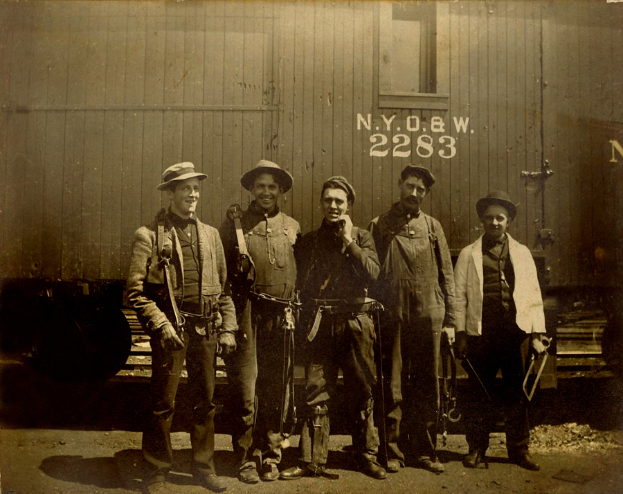 When I first started on the line crew there was a man and his nephew, I think it was them 2nd and 3rd from the left.. They were quite old at that time, for I was in my late teens. They had cabin on a mountain near Summitville station. They would not work winters and the both of them would get off at Summitville and go to their cabin. They were heavy drinkers, but put away enough to get them threw the winter. The oldest smoked a pipe and I remember seeing the nephew pass out in the bar next to the Norwich yards, he laid straight across a bar stool. The uncle dragged him back to the camp cars. Next day they were up raring to go. Amazing.