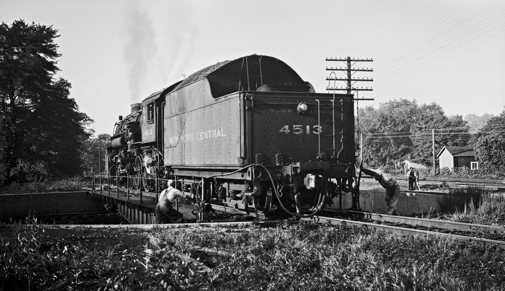 It's July 27th 1946, Jim Speer is taking photographs along the New York Central's West Shore Division. At Tappan, NY Jim catches the Tappan Local's locomotive number 4513 as it is being turned for the return trip to Weehawken, NJ. The locomotive is supplying compressed air to operate the pneumatic motor allowing this 70' turntable to be turned with ease. The NYC had 20 of these K-11b class 4-6-2 locomotives built by Alco in 1912. This K-11b's original number was 3113 and became 4513 in 1936. By the time of this photo there were only 15 of this class still in service and their numbers would dwindle with the last engines being scrapped in 1952. Note the garage to the right of the locomotive's pilot. Beginning in 1959 this was the residence of a very young Allan Seebach who grew up with the New York Central's West Shore Division as his playground. Caption and photos courtesy of Allan Seebach.