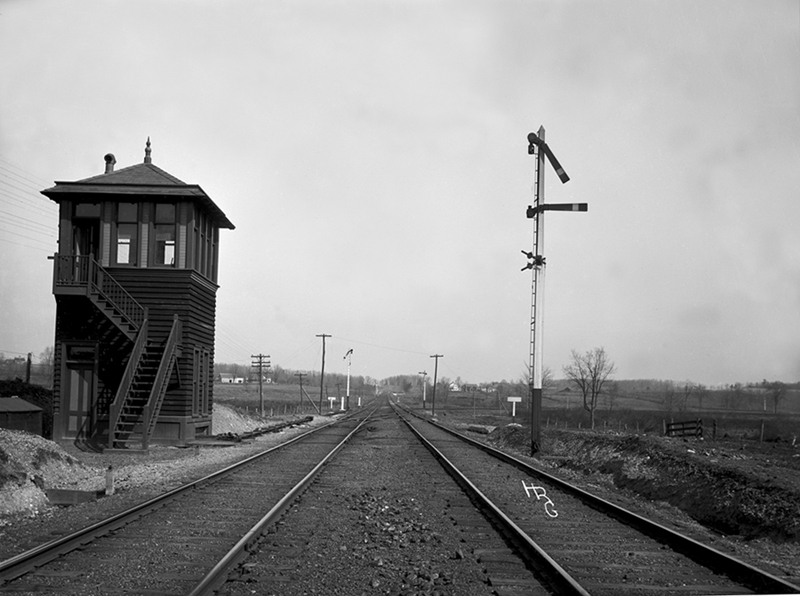 RF tower at Crawford Junction was a nine lever tower used to control the signals and switches shown in this photograph. During the 1880's until the 1920s, the Erie Railroad ran six passenger trains, a milk train and a local freight on the Pine Bush Branch. In this image, you can see the beginning of the Pine Bush branch curving off to the right. The view along the O&W is north toward Fair Oaks and the Catskills. This photograph is from the O&WRHS Glass Plate Negative Collection. Photoshopped by Ron Vassallo - Caption by Doug Barberio.