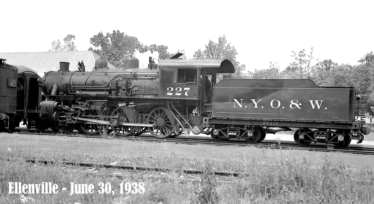 | Here is an interesting and very sharp image of Class E No. 227 switching a combination car at Ellenville on June 30, 1938. Many yard images are of freight moves, so the photos of passenger equipment being switched are often quite rare. It was a common practice of the O&W, on the branches where there was any appreciable package or express business left to handle, for a train to leave an empty baggage or combination car parked by the freight house or the baggage room on a house track. . . then to be loaded and picked up on some day following by another train. Photo and Caption Courtesy of Mal Houck. After Mal sent me this photo Doug Barberio contacted me and said he had another shot (see below)taken on the same day. Photo courtesy of Doug Barberio. |