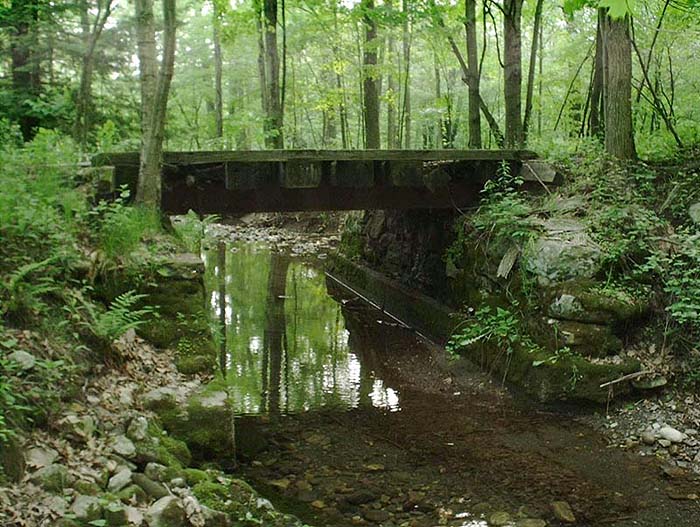 With the clock ticking away we got back in the Jeep and started to make our way down towards Summitville stopping briefly to take a look at the Mamakating Depot. The roadbed from the Mamakating to Summitville is in remarkable shape and again there are many ties on both sides. Nothing can beat the smell of fresh country air and O&W cinders and we were enveloped by both. We made it to Summitville in no time at all and made our way down to the old mining pit or as we used to call it the "sand pits" and stopped for a cool drink from a mountain stream being fed through this incredible O&W stone culvert. As Bob and I stood there taking in this piece of engineering little did we realize that a swarm of mosquitoes was taking us in! We're outta here!!!