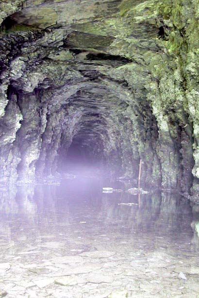 Mal HouckPhoto Middle Right: View of the interior of the O&W Highview Tunnel taken from just inside the south portal, July 24, 1999. Surprisingly vividly-colored mineralization of the upper walls and roof is shown. The tunnel is partly water-filled at the south end, here to a depth of inches but reportedly it was under six feet of water nearer the Wurtsboro portal. A red marker stick appears at right in the distance; this may be used to give observers some idea of the water's depth. No evidence of any form of lining material appears at this end of the tunnel. Taken with a Canon Powershot Pro70 digital camera and Canon Speedlight 380EX. Photo and caption by Seth Lewin.