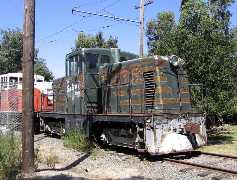 Here are some photos of the locomotive as it recently arrived. The first shows our three 44-tonners together. Leading is Visalia Electric 502, black with orange stripes. Next is Sacramento Northern 146 on the flatcar, in the red and white paint of its last owner, Northern Oklahoma. Last is the DS-2, also on a flatcar. Location is Dozier, California, the midpoint of our railroad, May 9 2005.The next two photos show the locomotive in storage at our museum. As you can see, it is rather rusty (remember, this was called the "Saltair Route" ). None the less, you can see that it would be quite a striking paint job if it were fresh.